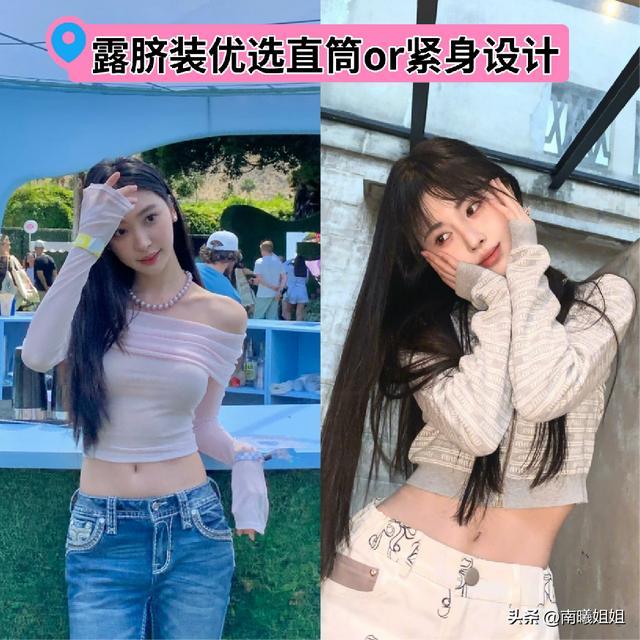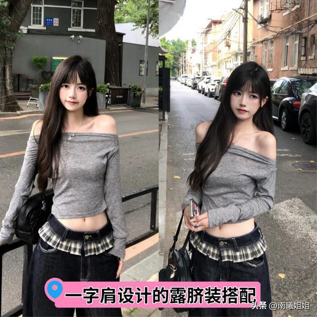 像这种露脐肩的搭配,也建议大家可以优先于选择一字肩的版型状态。相比较于圆领,又或者是方领而言其实这样能够将我们肩颈部位以及锁骨部位的完美线条都凸显出来,如果你的身材状态有这样的优势,那么建议大家可以放心的进行入选,真的好看又好穿。