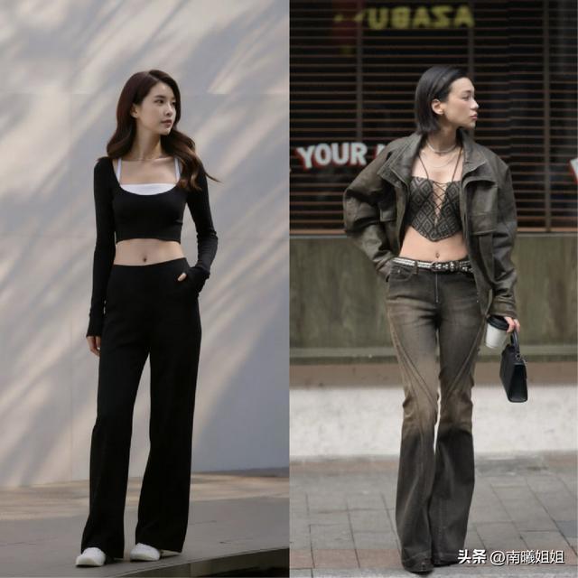 下半部分的搭配如果选择的是长款裤装的话,那么像这样的版型状态,更推荐大家可以首选运用厚底鞋或者是增高鞋这一类,像露脐装再结合长款下半身单品的时候,就非常适合运用自带时髦感的鞋子,低跟鞋,高跟鞋或者是厚底鞋,在当下的这个阶段当中都非常的适用,大家放心搭配。