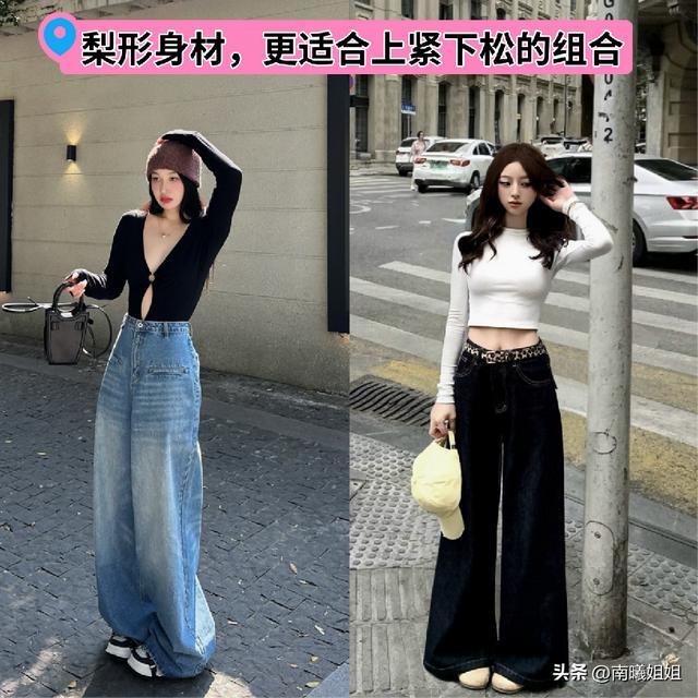 根据身材的状态,大家也可以组合整理出来于你而言更加极具优势的穿搭,例如你是属于梨形身材的话,那么上半部分是属于比较纤细的,就可以结合紧身设计的露脐装。再搭配宽松设计的下半身单品,尤其是在臀胯的部位,一定是属于宽松版型的状态进行遮掩的处理,这样的对比效果又显瘦又能够遮挡身形上的不足之处。